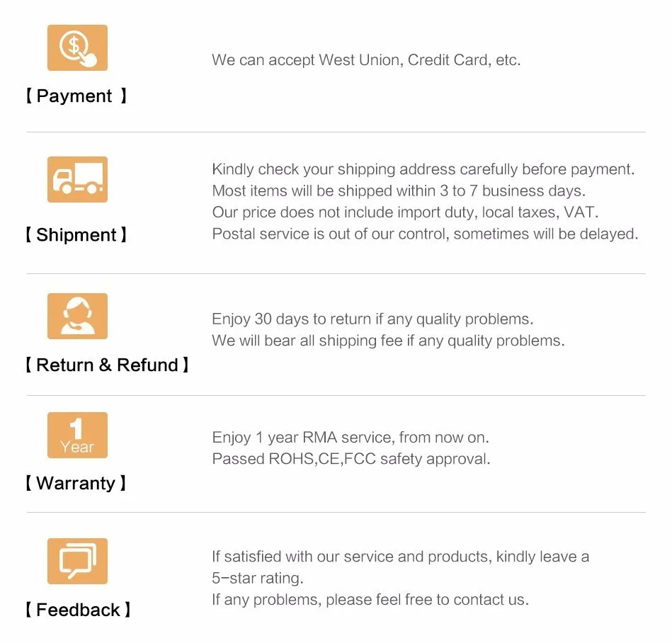 If the product you receive is not as described or low quality, the seller promises that you may return it before order completion (when you click "Confirm Order Received" or exceed confirmation timeframe) and receive a full refund. The return shipping fee will be paid by you. Or, you can choose to keep the product and agree the refund amount directly with the seller.N.B.: If the seller provides the "Longer Protection" service on this product, you may ask for refund up to 15 days after order completion.