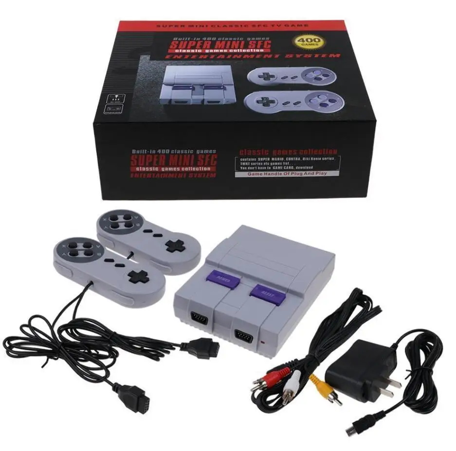 SUPER Mini 8-bit Classic Game Console Entertainment Built-in 400 Games Christmas Gift for Kids Built-in 400 classic games, let you enjoy yourself in the game worldComes with two high quality controllers, audio video cable and AC adapterCan be connected to TV with AV cable for large screen game playingSmall and convenient size thats easy to carry, use and travel with everywhere you goA great Christmas gift for your kids or your friendsSpecification:Input: AC 220 VOutput: DC 6V-150mATV signal system: PAL-DTV status: AVWhats included :1 x Game Console2 x Wired Controllers1 x AV Cable for TV1 x Power Plug1 x User ManualReturn Policy